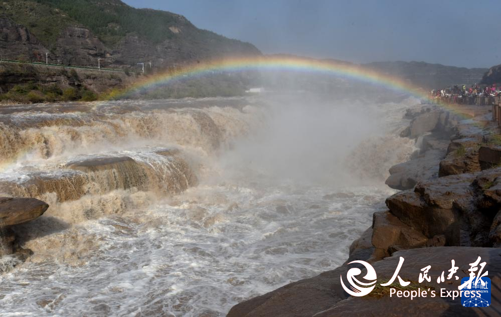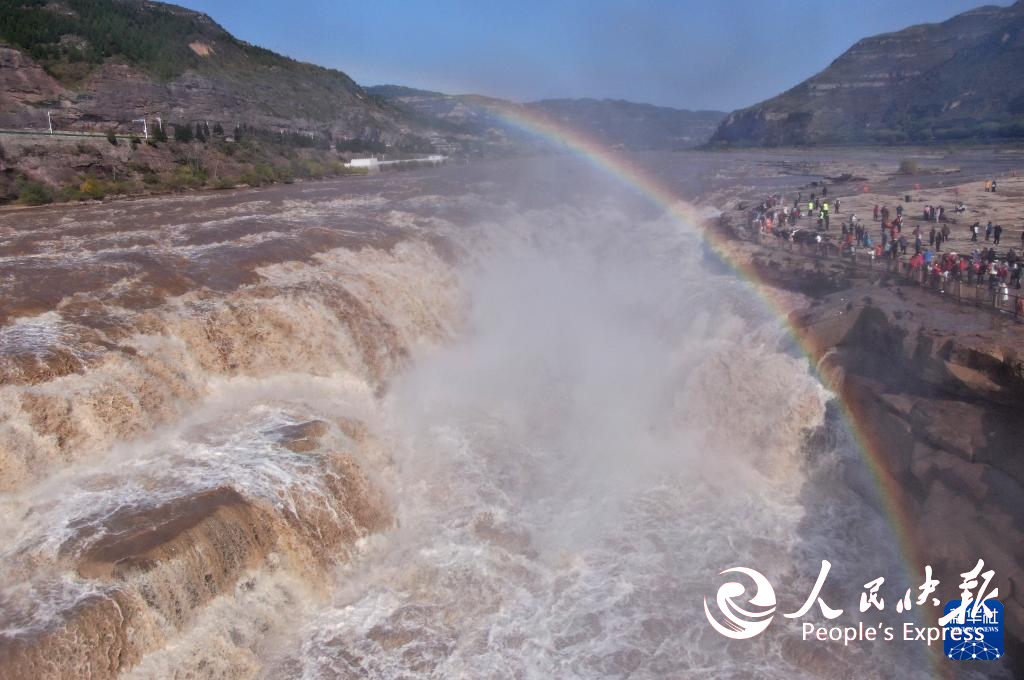 10月27日,位于山西吉县和陕西宜川县交界的黄河壶口瀑布景区天气晴好,飞溅的水雾在阳光照射下,形成一道壮美的“彩虹桥”。