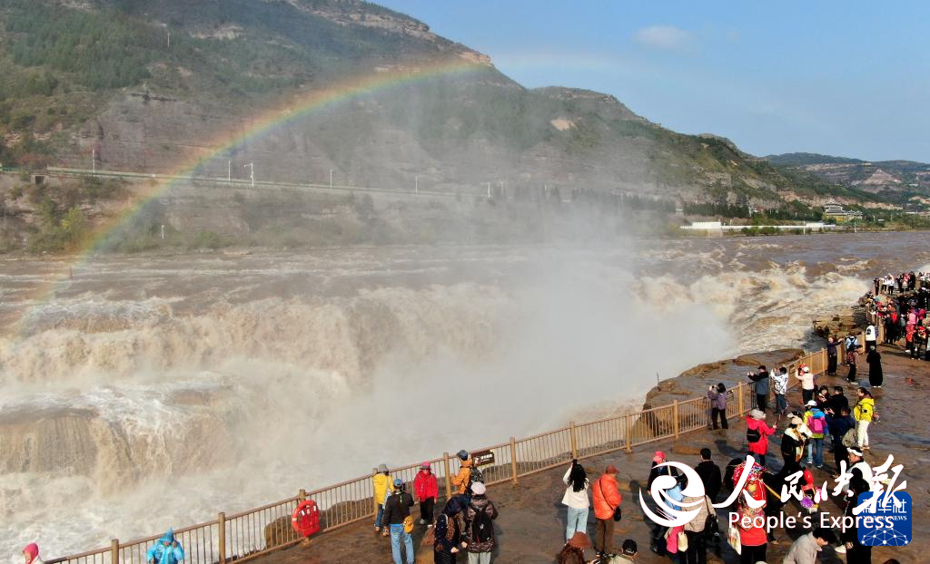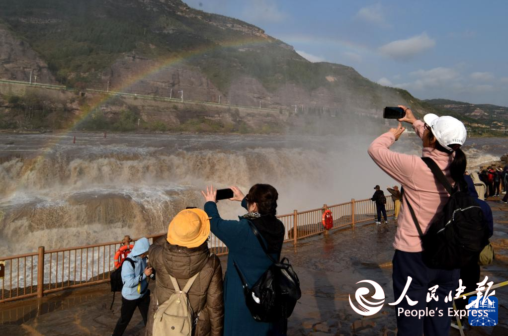 10月27日,游客在山西吉县黄河壶口瀑布景区欣赏“彩虹桥”景观。