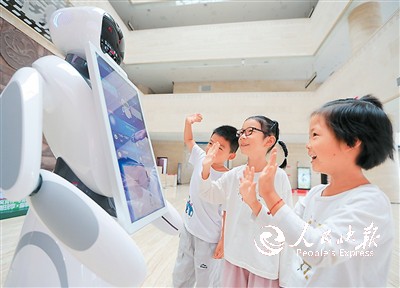 近年来,湖北省荆门市博物馆持续推动数字赋能,将文物信息转化为可触摸、可交互的数字资源。图为荆门市博物馆内,小朋友与机器人互动。赵 平摄(人民视觉)
