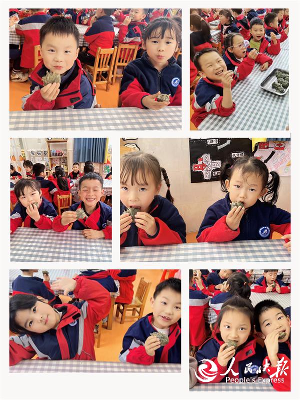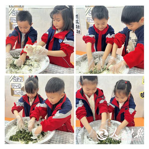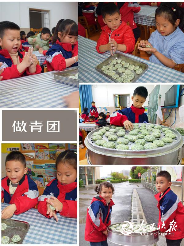 洗手、揉面、塑形,孩子们一步步跟着老师操作,小小的双手揉着软糯的面团,再搓成圆圆的团子。虽然动作有些笨拙,但每一个孩子都格外专注,一个个绿油油、圆滚滚的青团很快就制作完成了。看着自己亲手做的青团,孩子们满是成就感;品尝着香甜的青团,孩子们不仅尝到了春天的味道,更在动手实践中,感受着清明食俗的文化内涵,体会传统美食带来的快乐。